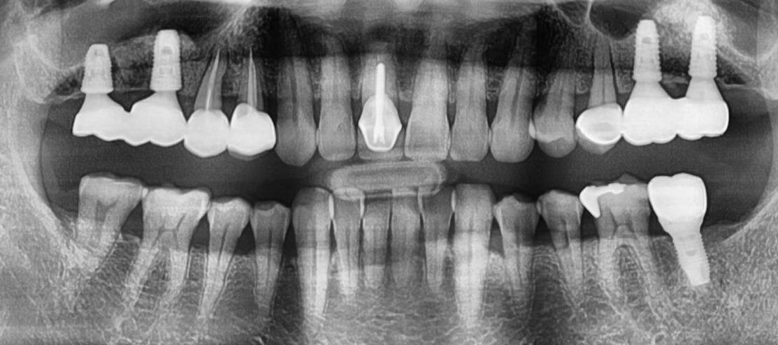 This patient was suffering from significant pain in her upper jaw due to infection. I performed extensive bone grafting procedures, including a sinus lift, to prepare the site for implant placement. Five dental implants were successfully placed, and the patient recovered without any complications.