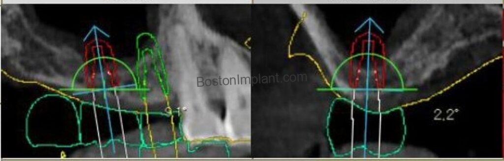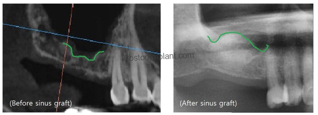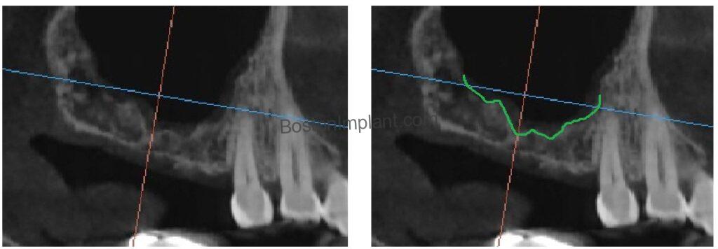Clinical Insight: In the surgical planning image above, you can see that more than half of the projected implant length would have sat in the empty space (dark area) of the sinus cavity rather than in solid bone (white area). So, we planned sinus graft on upper right side. For more information about sinus graft, check out this post below
