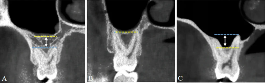 (Schematic diagram of classification of maxillary sinus pneumatization. A Type I normal pneumatization; B and C Type II extensive pneumatization. Yellow dashed line: horizontal line at the sinus floor; blue dashed line: horizontal line at the root apex; white double-headed arrow: distance between the sinus floor and the root apex. *)