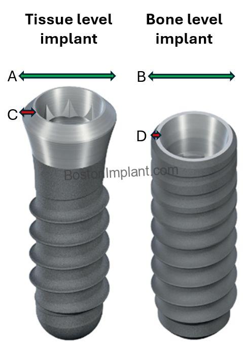 As illustrated in the image above, tissue-level implants feature an additional coronal portion that resides at the gingival level. This design makes them longer and wider at the top compared to bone-level implants. This seemingly small difference significantly impacts implant longevity. I will explain the two key advantages of tissue-level implants for long-term success.