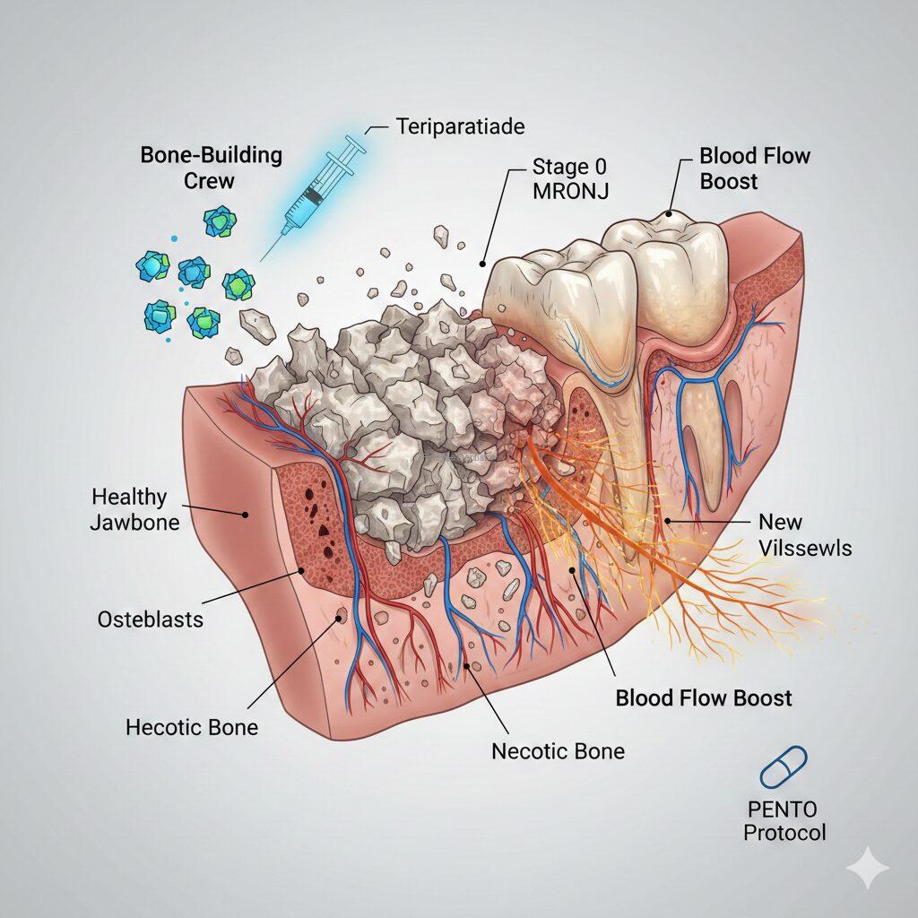 • For Cancer Patients (PENTO Protocol): Since Forteo isn’t usually recommended for cancer patients, doctors use the PENTO Protocol (Pentoxifylline and Vitamin E). This “softens” scarred tissue and brings fresh blood supply back to the jawbone.